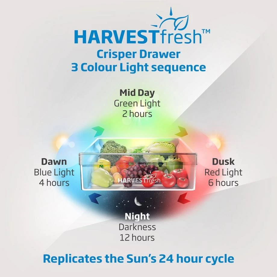 Featuring HarvestFresh technology, your food will stay fresher for longer. It uses three colour light technology in the salad drawer to cleverly mimic the sun’s 24-hour light cycle. This preserves vitamins and minerals inside your fruit and vegetables for five additional days, resulting in less waste.