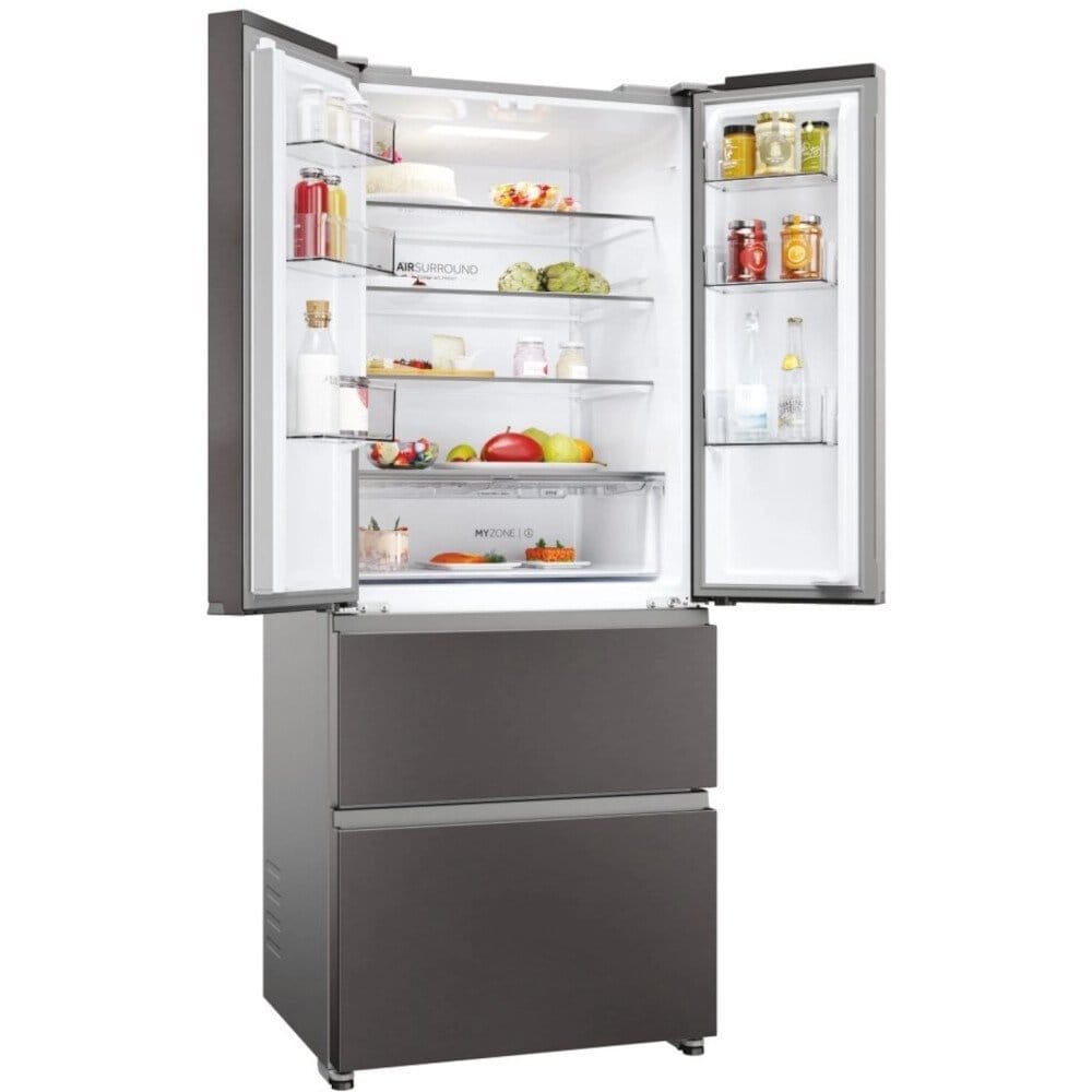 With Haier Air Surround Fresher Tech, the air flows all around the refrigerator in a more gently and soft way. Thanks to the special lateral outlets, from where the air is distributed, this system homogeneously distributes cold air embracing the food in the whole fridge cavity thus avoiding direct flow on food and without causing weight loss and food drying. That’s why Haier Air Surround maintains food taste, consistency and juiciness up to 99% after 7 days like Day 1.